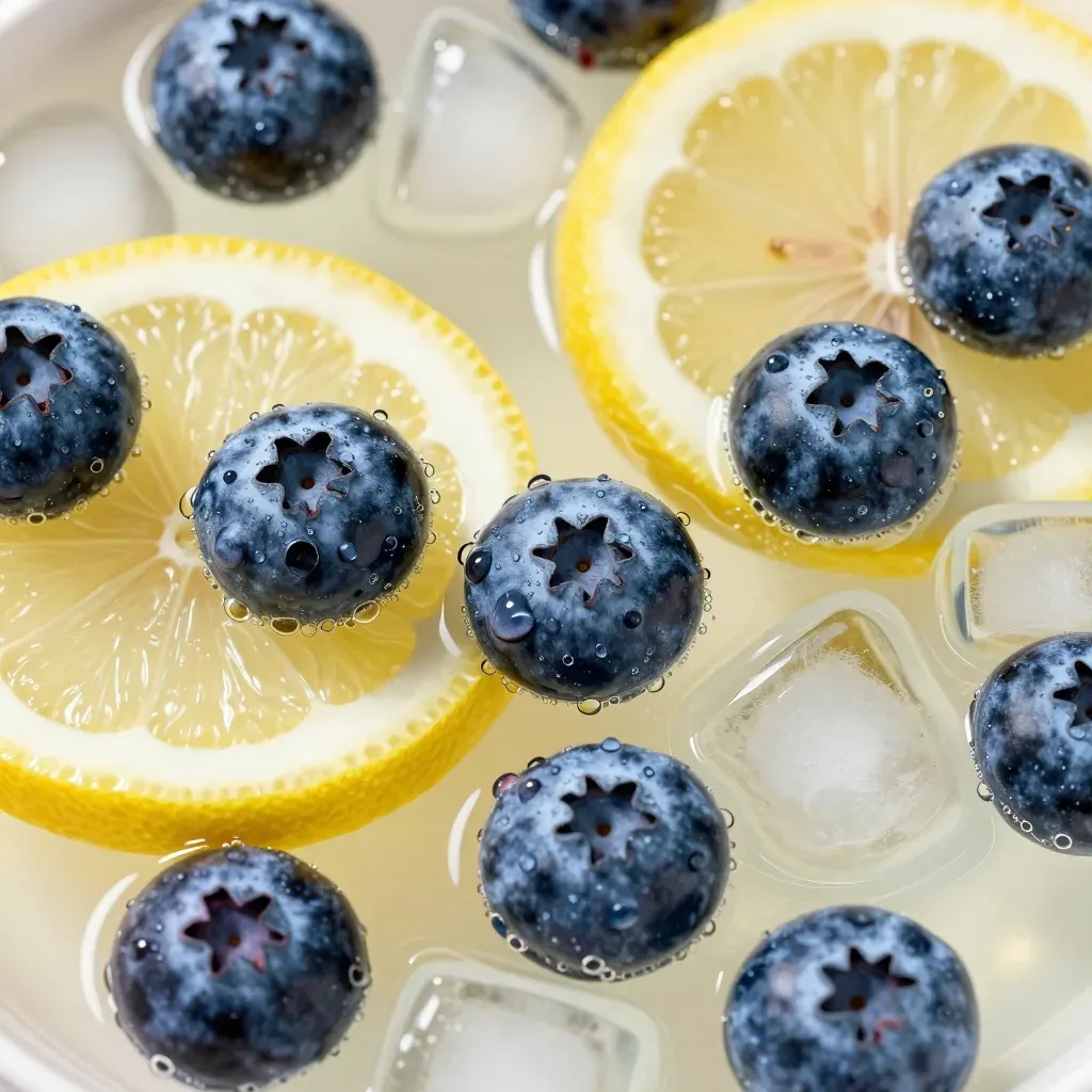 Glossy lemon slices and vibrant blueberries are arranged in ice cubes, creating a refreshing and visually appealing composition. The bright, direct lighting highlights the textures and colors vividly, while the shallow depth of field and clean background provide a crisp and focused presentation.