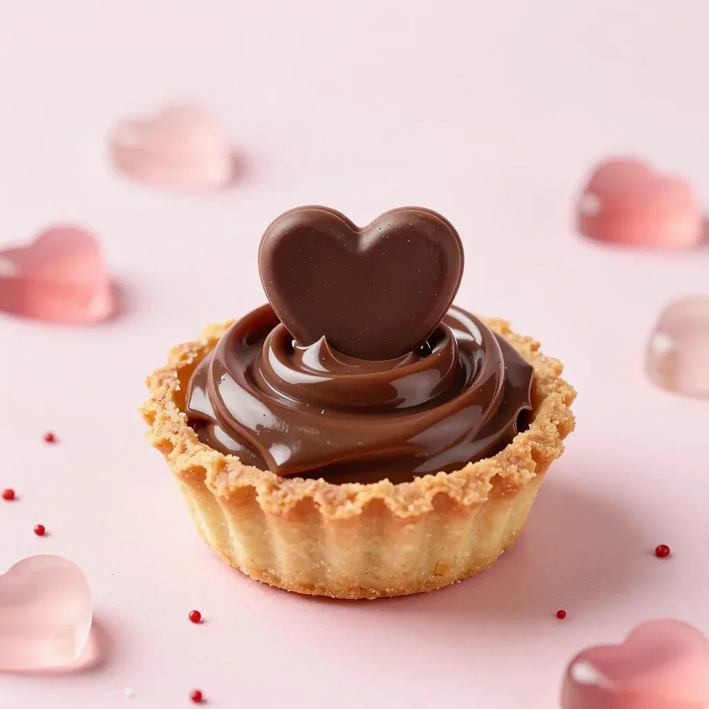 A mini chocolate tart features a crisp fluted pastry shell filled with glossy chocolate ganache and topped with a smooth chocolate heart, surrounded by scattered translucent pink hearts and red sprinkles. Soft diffused lighting from the upper left creates gentle highlights and subtle shadows, with a shallow depth of field emphasizing the tart while softly blurring the background elements.