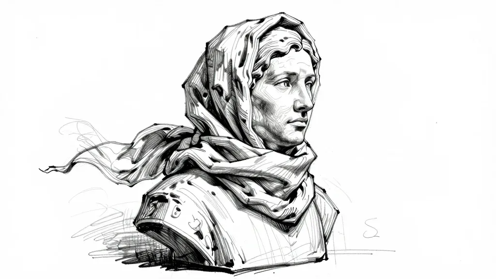 A rugged traveler's bust, adorned with a patterned headscarf and textured garment, bathed in directional sunlight that highlights the contours and folds, set against a minimal desert background. The monochromatic palette emphasizes the weathered and adventurous nature of the subject.