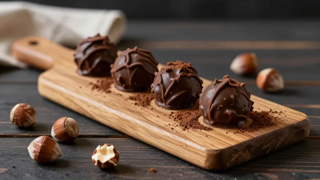 Four glossy chocolate truffles with hand-piped ridges rest on a rustic wooden board, surrounded by whole and cracked hazelnuts and dusted with fine cocoa powder. Soft directional lighting from the upper left creates gentle highlights and shadows, while shallow depth of field emphasizes the central truffles against a blurred dark wooden background with a linen cloth.