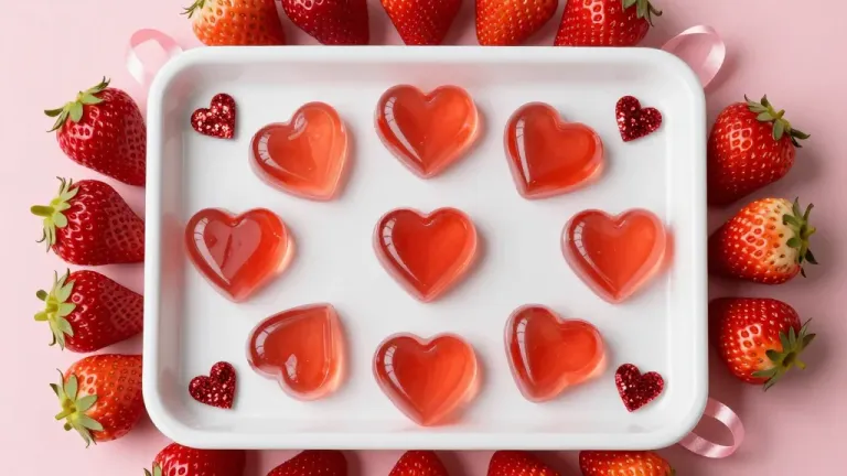 Heart-shaped gelatin molds arranged in a grid, with fresh strawberries framing the scene, under soft, diffused lighting that creates gentle highlights and subtle shadows, emphasizing the glossy texture of the gelatin and the vibrant red of the strawberries against a pink background.