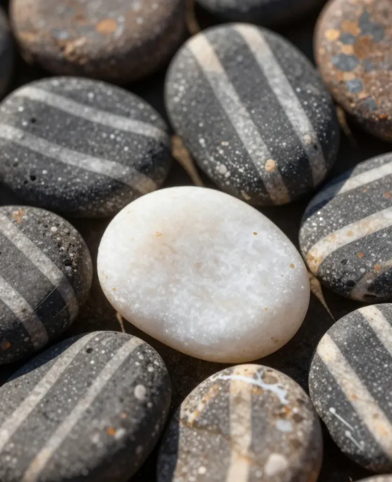 A single white pebble contrasts sharply with dark, striped pebbles, creating a striking visual. Directional lighting highlights the white pebble, enhancing its glossy texture, while the dark pebbles are softly lit, adding depth and framing the subject.