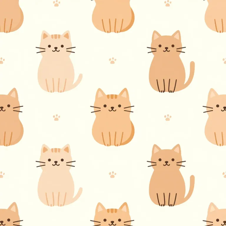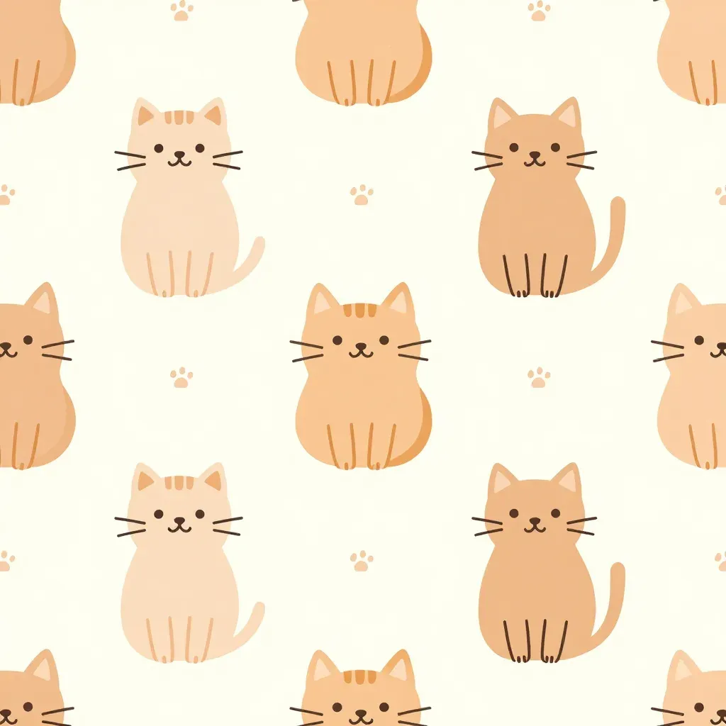 A repeating pattern of seated cats in warm beige and peach tones, interspersed with small paw prints, rendered in a soft, hand-drawn illustrative style. The even, diffuse lighting and uniform off-white background create a seamless, tileable design with balanced spacing and no focal point.