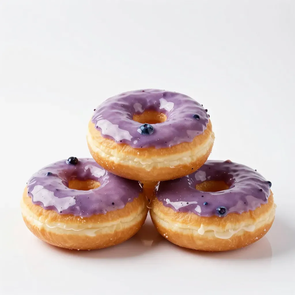 Golden-brown donuts with glossy purple glaze and blueberries stacked in a triangular formation, illuminated by soft, diffused light that creates gentle highlights and shadows, emphasizing the texture and color contrast against a plain white background.