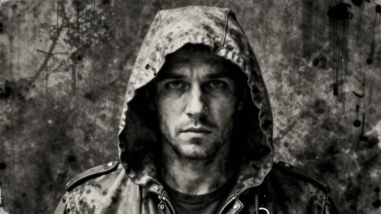A hooded figure with an intense gaze, partially obscured by a worn, dark hood, set against a grungy, textured backdrop with splatters and smudges. The high-contrast lighting and sharp shadows highlight the figure's features, creating a dramatic and gritty atmosphere.