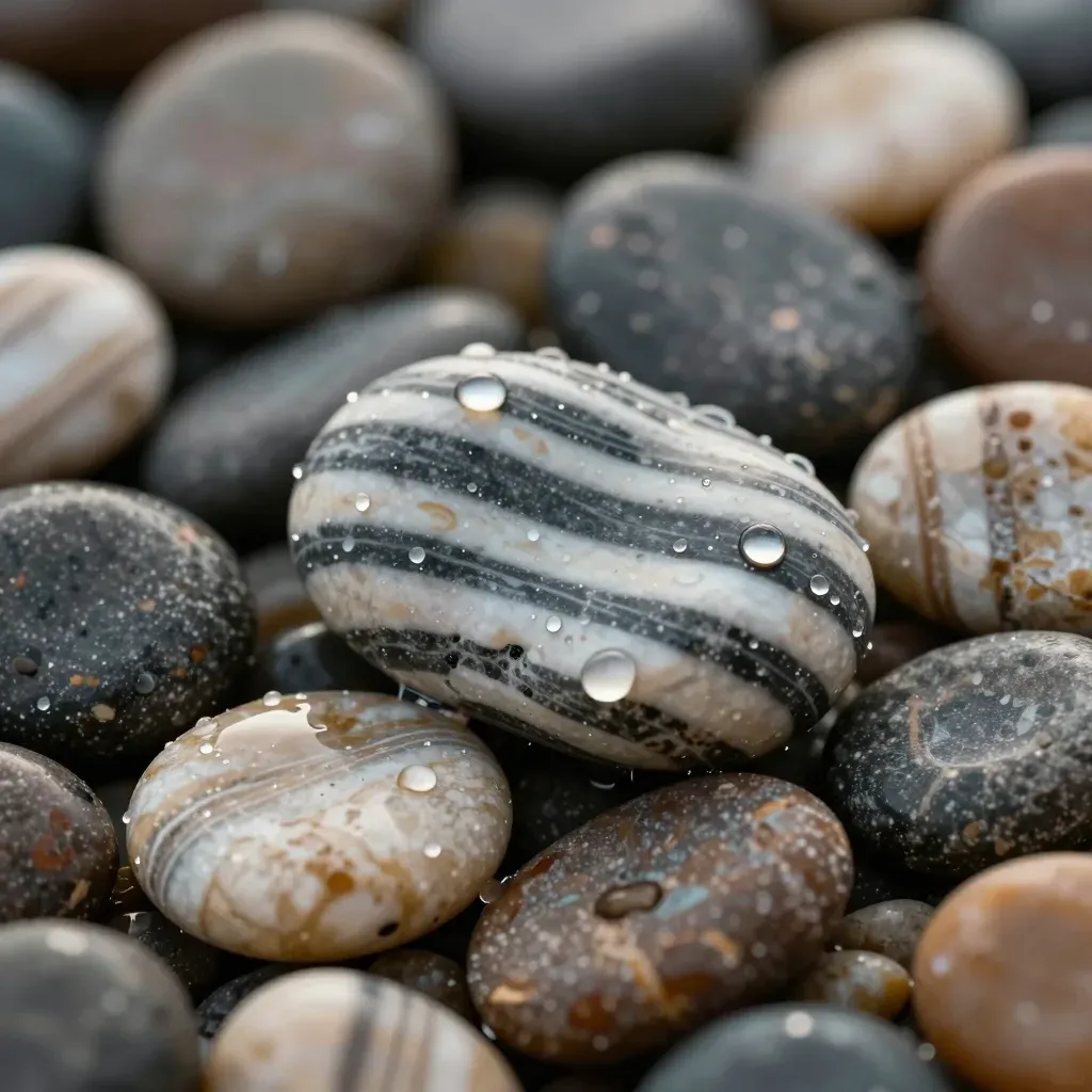 Close-up of glossy, striped pebbles with water droplets, illuminated by soft, diffused light that enhances their reflective sheen and creates a serene, natural setting. The shallow depth of field and blurred background emphasize the pebbles' textures and colors, making it ideal for nature and texture-themed designs.
