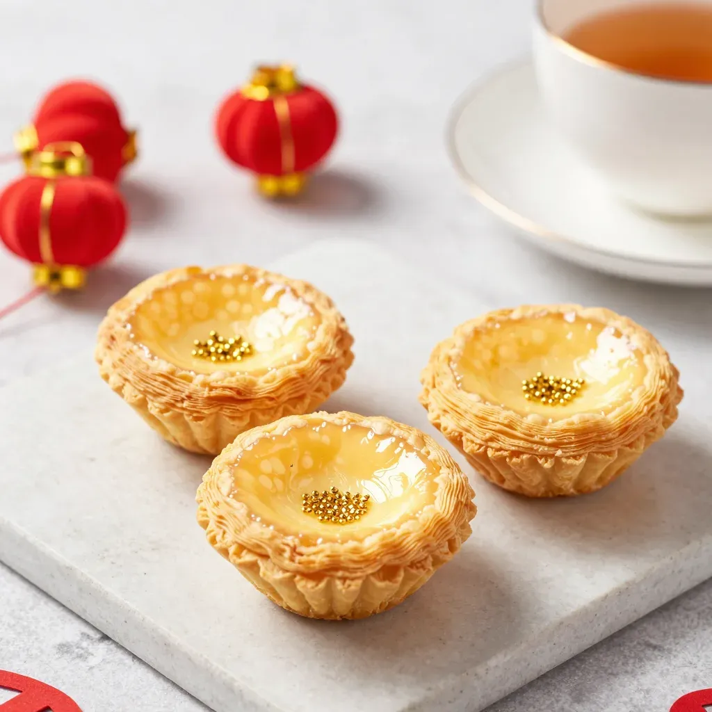 Three golden pastry cups filled with creamy custard, set against a soft, diffused light that highlights their flaky texture and glossy filling, with a shallow depth of field that draws attention to the tarts. The blurred red lanterns and cup of tea in the background suggest a festive setting, creating a warm and inviting atmosphere.