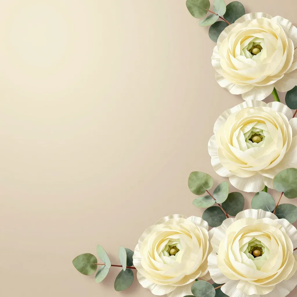 Soft, glossy buttercream ranunculus flowers and rough eucalyptus leaves are arranged in a corner, illuminated by diffused, warm light that creates soft shadows and highlights. The neutral beige background enhances the subject, providing a clean and minimalistic setting.