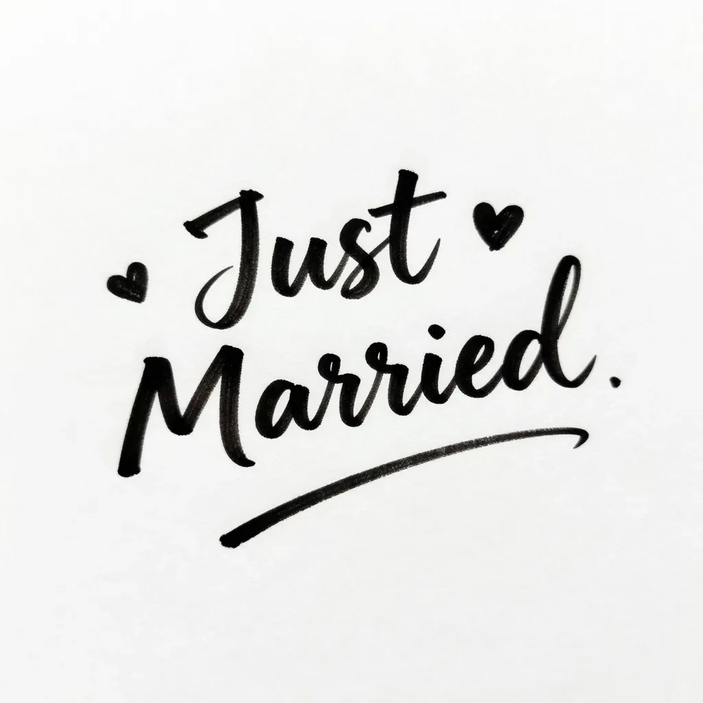 A smooth, glossy black 'Just Married' script with black hearts is centered on a pure white background, illuminated by even, soft light that creates a gentle glow on the ink. The clean and uncluttered backdrop provides ample copy space for various design applications.