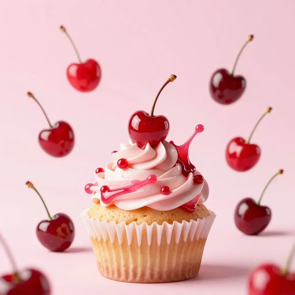 A close-up of a cupcake with white frosting and cherries, featuring a glossy glaze splash, set against a soft pink background. The diffused lighting highlights the glossy textures and creates subtle shadows, enhancing the visual appeal and depth of the image.