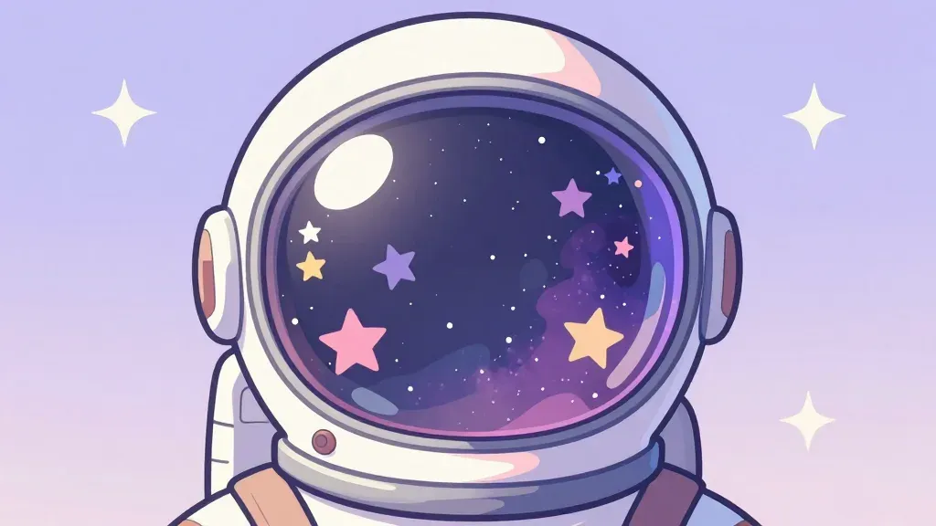 A close-up of a glossy astronaut helmet with a reflective visor, capturing the serene beauty of space with soft, diffused lighting. The pastel lavender and pink gradient background enhances the ethereal quality of the image, making it ideal for design elements requiring a tranquil, cosmic theme.
