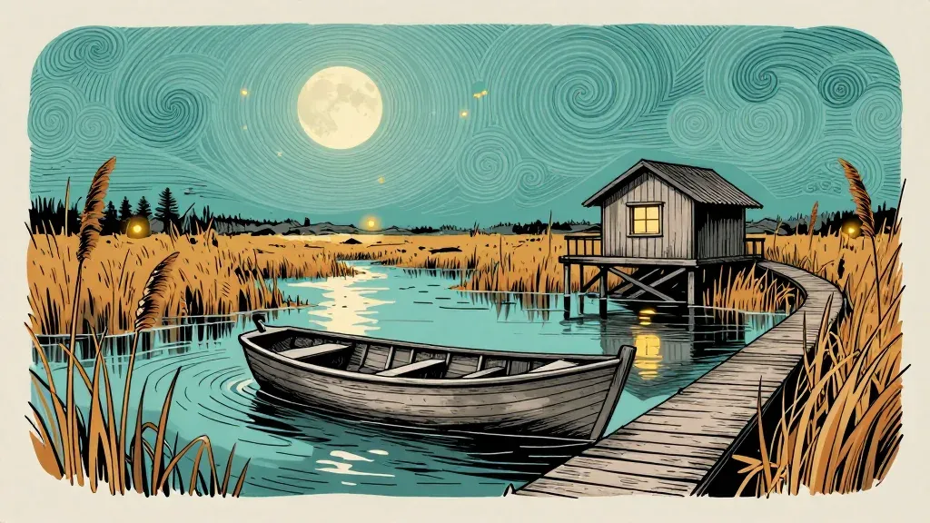 A serene scene of a wooden cabin on stilts surrounded by reeds and two boats on a dock under a full moon, with soft reflections on the glossy water. The composition creates depth with the water and reeds, and the warm glow from the cabin window contrasts with the cool blues of the night sky.