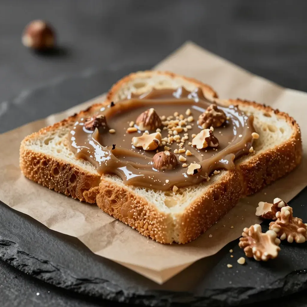 A close-up of a toasted bread slice topped with a glossy hazelnut spread and crunchy nuts, highlighted by soft, diffused lighting that accentuates the textures and warm color palette. The shallow depth of field and dark, blurred background ensure the subject is the focal point.