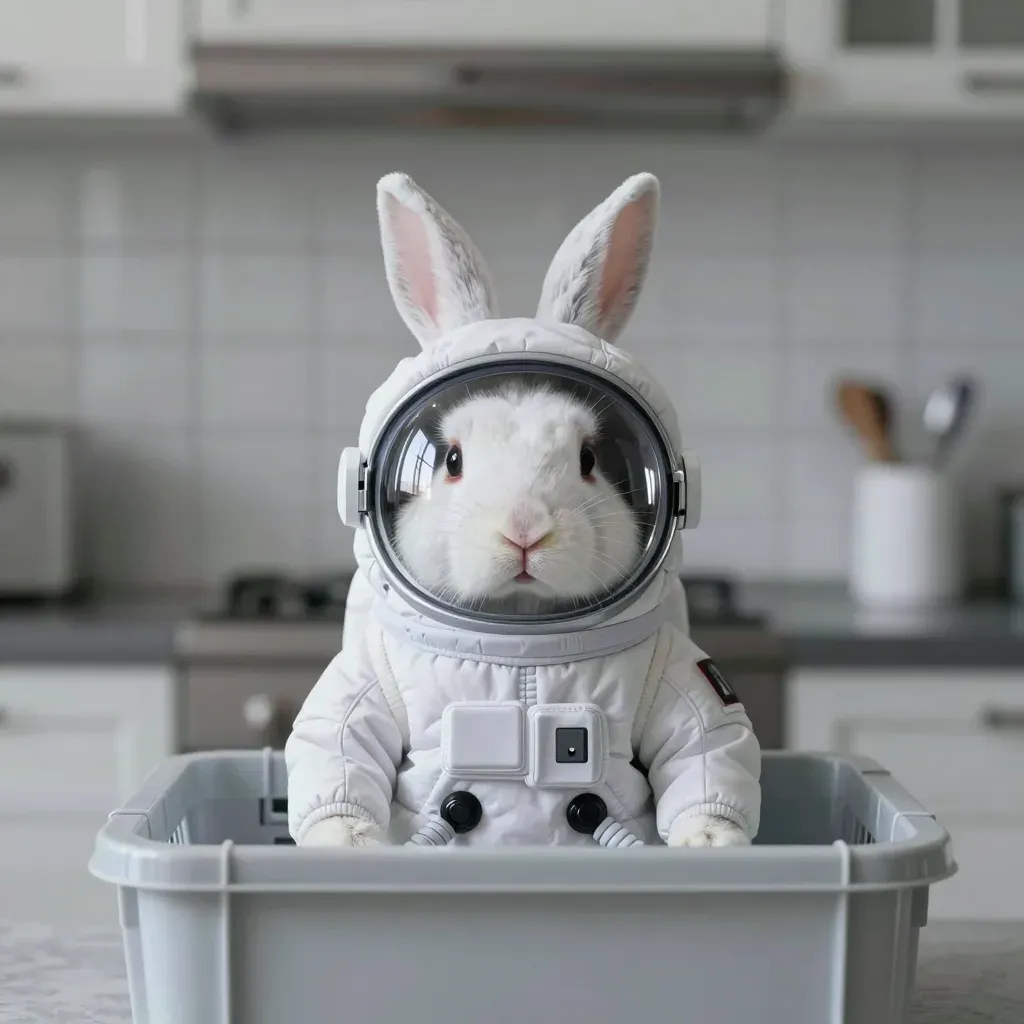 A white rabbit in an astronaut suit sits in a gray plastic crate, illuminated by soft, diffused light that highlights its fur and the suit's details. The modern kitchen background, slightly blurred, emphasizes the rabbit as the focal point.