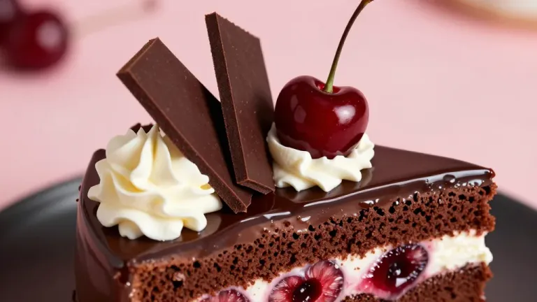 A close-up of a decadent chocolate cake slice adorned with a glossy cherry and chocolate shards, highlighted by soft, warm lighting that accentuates the textures and colors. The shallow depth of field and blurred pink background create a clean, focused composition ideal for culinary and dessert-themed designs.