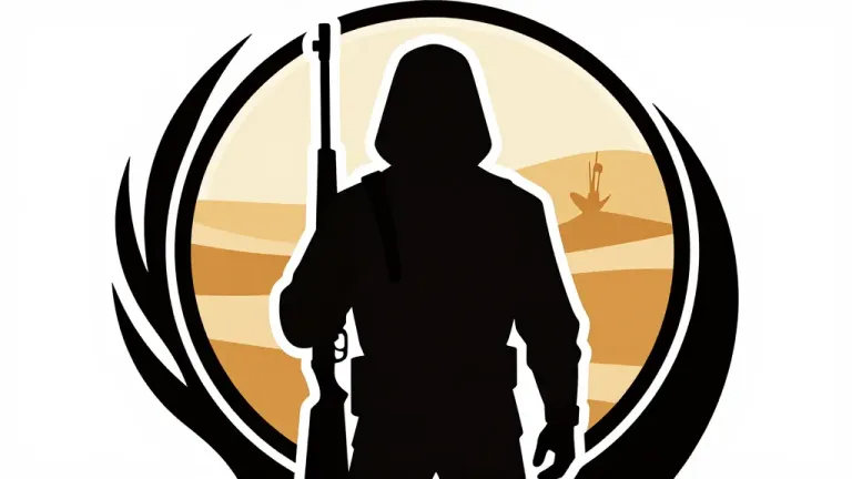 A rugged desert ranger stands with a rifle and staff, facing away, against a textured, warm-toned desert backdrop. Direct, high-contrast lighting emphasizes the ranger's silhouette and the vastness of the desert environment.