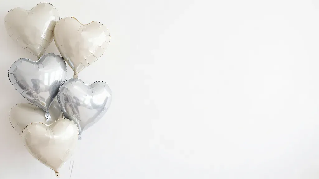 A cluster of silver and white heart-shaped balloons softly illuminated, creating a gentle interplay of light and shadow. The pure white background enhances the balloons' reflective surfaces, offering ample copy space for design integration.