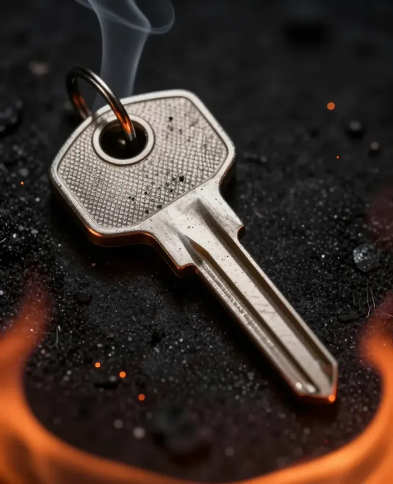 A metal key with charred edges and a smoking keyhole is surrounded by intense orange flames, casting dynamic shadows and highlights. The dark, smoldering background with scattered embers and smoke enhances the dramatic atmosphere, providing ample copy space for design elements.