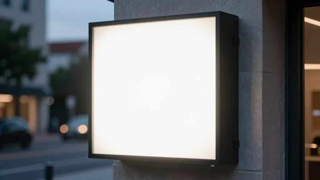 A smooth, glossy lightbox glows softly against a rough, textured stone wall, creating a striking contrast. The shallow depth of field blurs the urban street scene in the background, emphasizing the lightbox as the focal point.