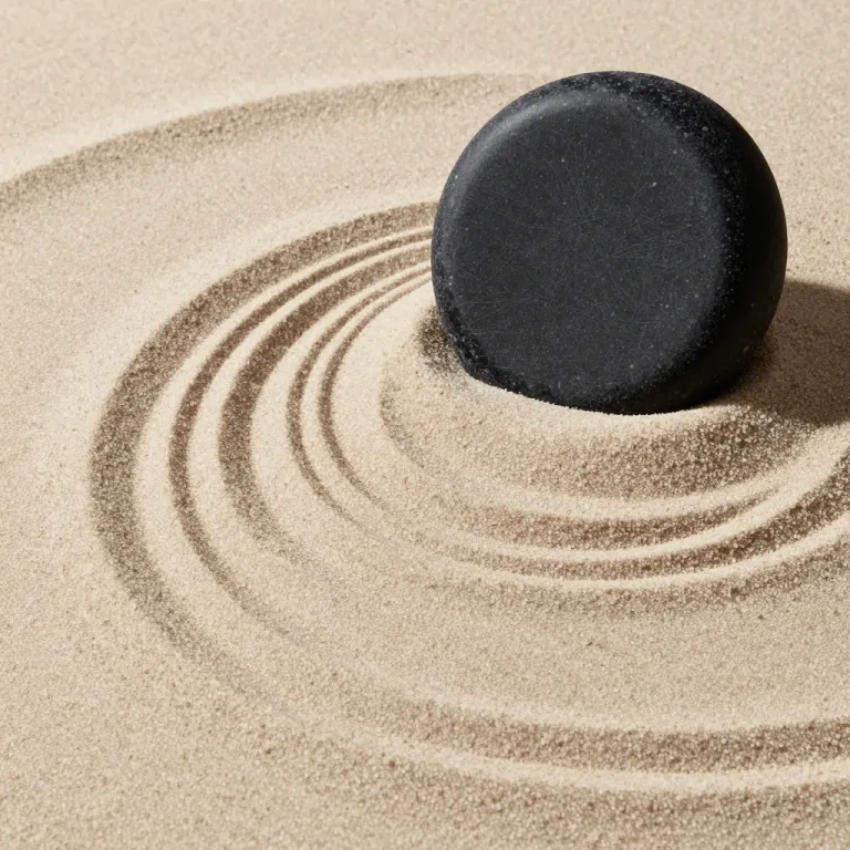 A smooth, glossy basalt disc sits centered in concentric ripples of fine beige sand, with soft highlights on its curved surface and gentle shadows defining the sand's granular texture. The shallow depth of field emphasizes the disc and immediate swirls, while the uniform, undisturbed sand background provides a minimalist, meditative setting.