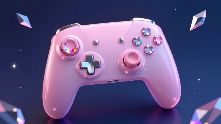 A glossy, iridescent game controller adorned with gemstones is showcased against a dark blue, starry background, highlighting its sleek design and vibrant details. The soft, diffused lighting accentuates the controller's glossy texture and the multicolored gemstones, creating a visually striking composition.