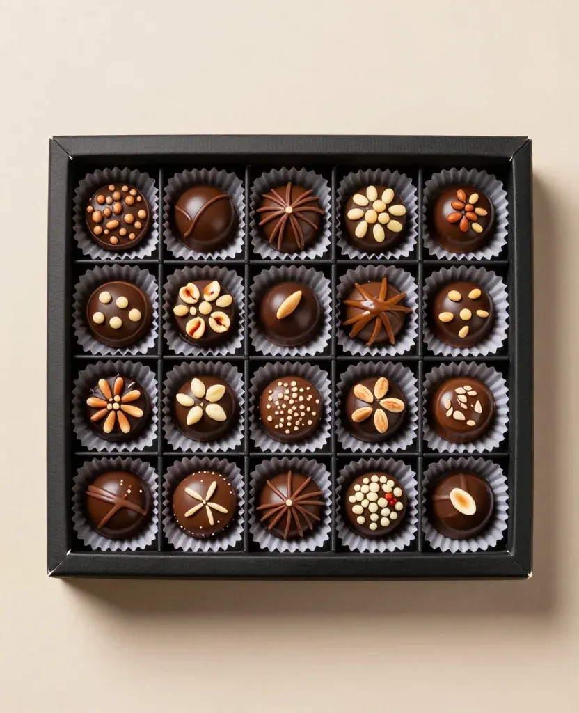 A grid of glossy chocolate bonbons adorned with nuts, seeds, and sprinkles, softly lit to highlight their textures and intricate toppings. The neutral beige background ensures the chocolates stand out prominently.