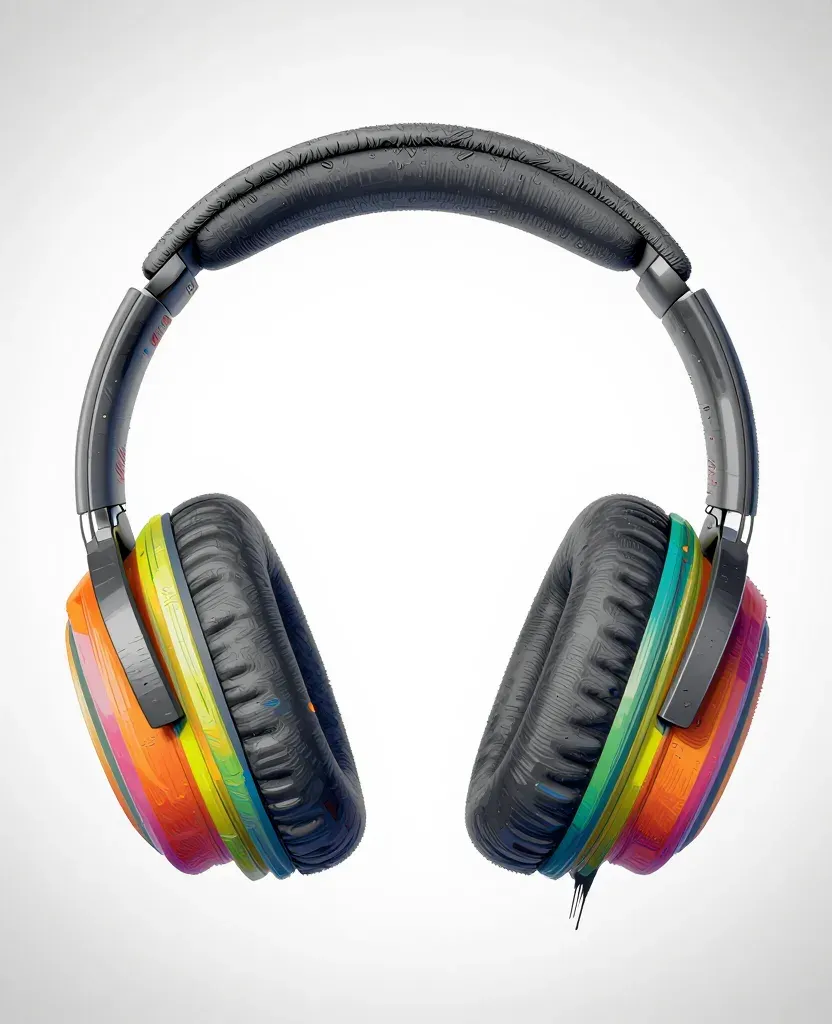 Glossy, vibrant color wave headphones with textured rubber ear cups and embossed headband, softly lit to highlight the curves and contours, set against a plain white background for maximum focus and copy space.