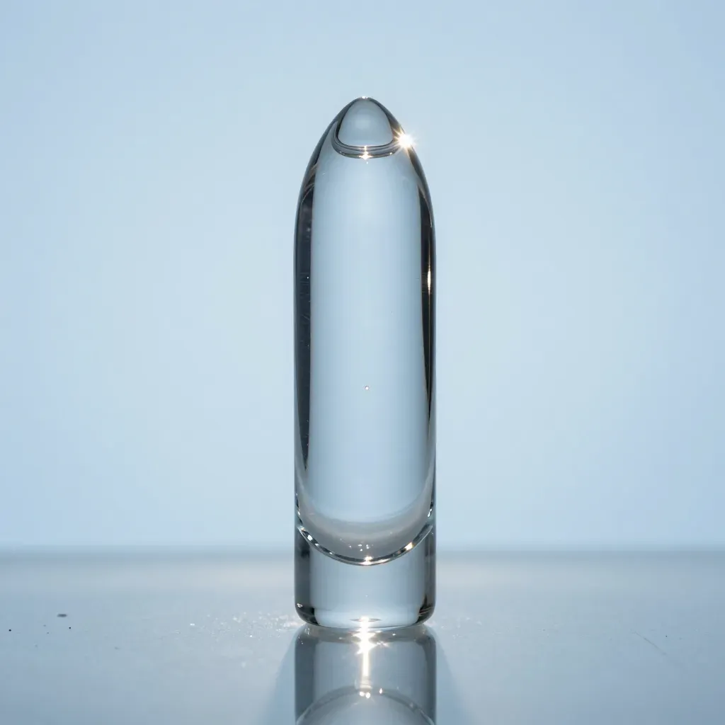 A smooth, glossy, translucent teardrop-shaped crystal is highlighted by soft, diffused lighting, creating subtle highlights and reflections. The crystal is centered with a shallow depth of field, keeping it in sharp focus against a calm gradient blue background.