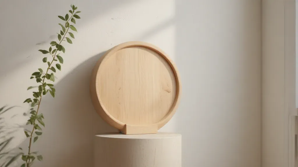 A light wooden structure with a circular top and a cylindrical base, adorned with soft green leaves, bathed in soft natural light that creates highlights and shadows, emphasizing the clean white wall background with minimal depth of field.