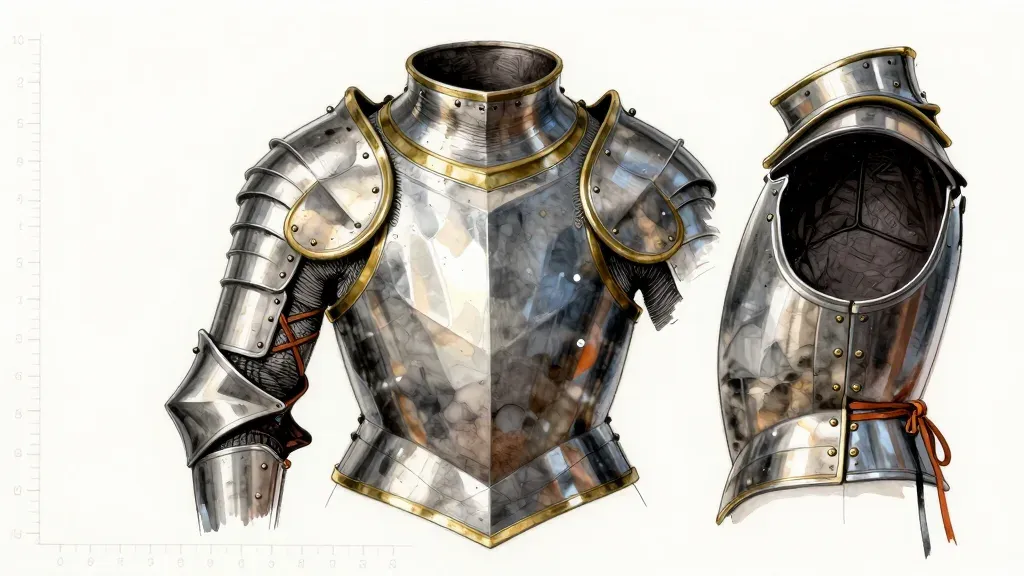 A detailed rendering of a glossy metal cuirass armor, showcasing its intricate design and reflective surface under soft, diffused lighting. The minimal white background ensures the focus remains on the armor's craftsmanship and texture details.