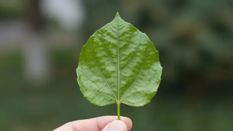 A glossy green leaf held delicately between fingers, illuminated by soft, diffused natural light that highlights its intricate veins. The shallow depth of field blurs the serene natural background, creating a focused and intimate composition.