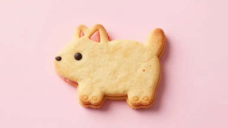 A golden-brown dog-shaped cookie with a pink filling and detailed decorations is centered against a soft, diffused light background, highlighting its texture and vibrant colors. The slight tilt of the cookie adds a dynamic element to the composition, making it visually engaging for product displays and food photography.