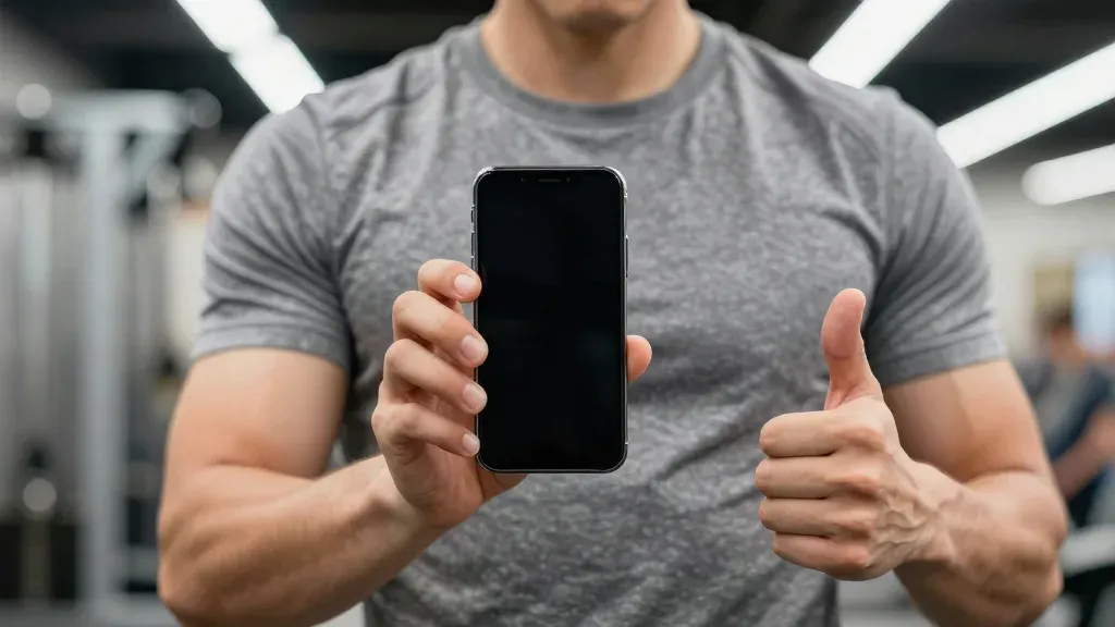 A man displays a smartphone and fitness tracker in a gym setting, with bright, even lighting and a shallow depth of field. The glossy black finish of the smartphone and matte black surface of the fitness tracker contrast with the man's gray t-shirt and the metallic gym background.