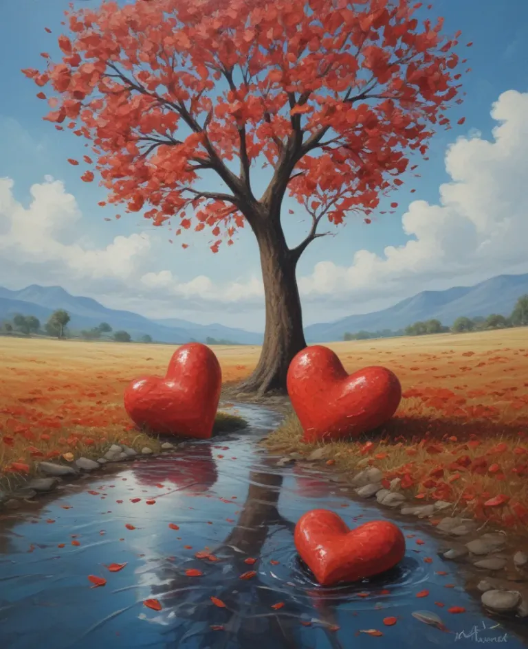 Two glossy red hearts and a tall tree with red leaves reflect in a small stream, surrounded by dry grass and scattered petals under soft golden light. The expansive background of distant mountains and scattered clouds enhances the serene and expansive context.