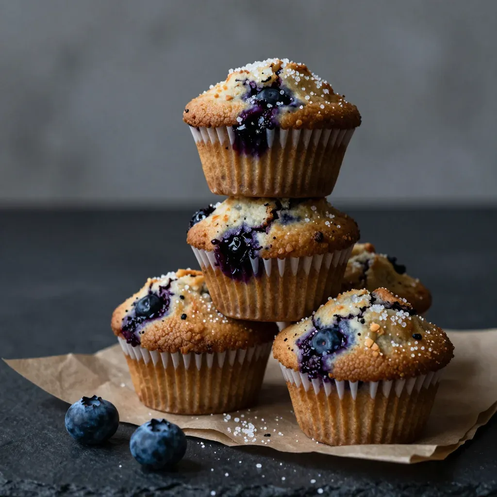 A tower of golden-brown blueberry muffins, glossy with sugary glaze, sits atop parchment paper, softly lit to highlight textures and vibrant blue berries. The neutral gray background ensures the focus remains on the delectable treats.