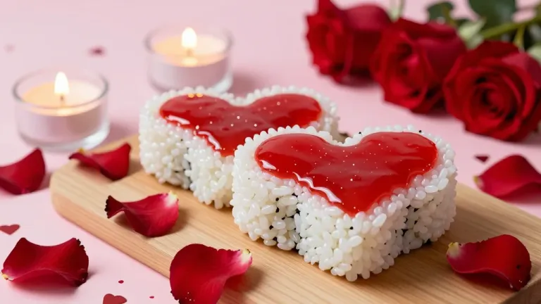 A heart-shaped sushi roll with glossy red sauce and creamy white rice, surrounded by soft pink rose petals, creating a romantic and elegant atmosphere. The soft, warm lighting highlights the glossy sauce and smooth rice, emphasizing the delicate textures and vibrant colors.