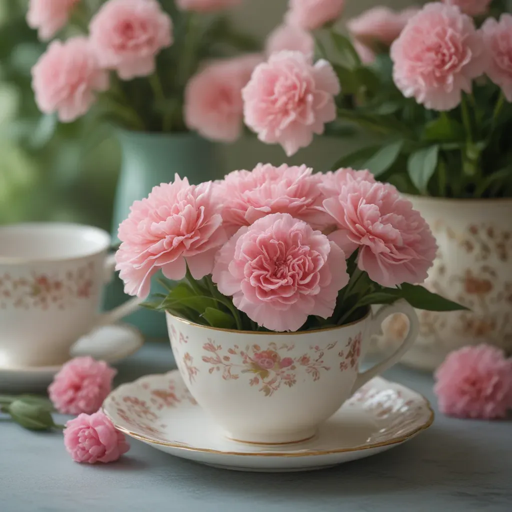 Soft pink carnations bloom in a vintage teacup, bathed in gentle natural light that highlights their delicate petals and glossy glaze. The blurred background of additional teacups and greenery adds depth and context, making the image ideal for a serene, elegant setting.
