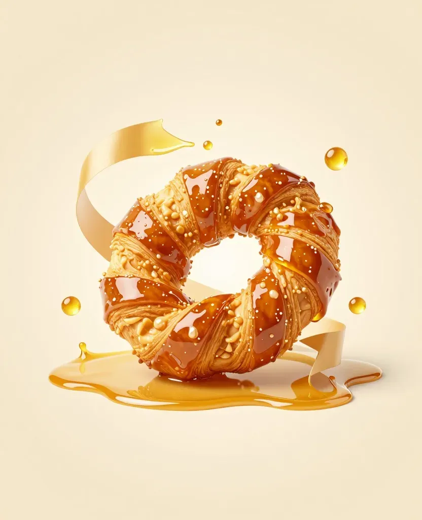 A golden cruller is coated in a glossy caramel glaze, with warm, diffused light highlighting its flaky texture and creating soft shadows. The neutral beige background and shallow depth of field emphasize the cruller, making it perfect for food and dessert imagery.