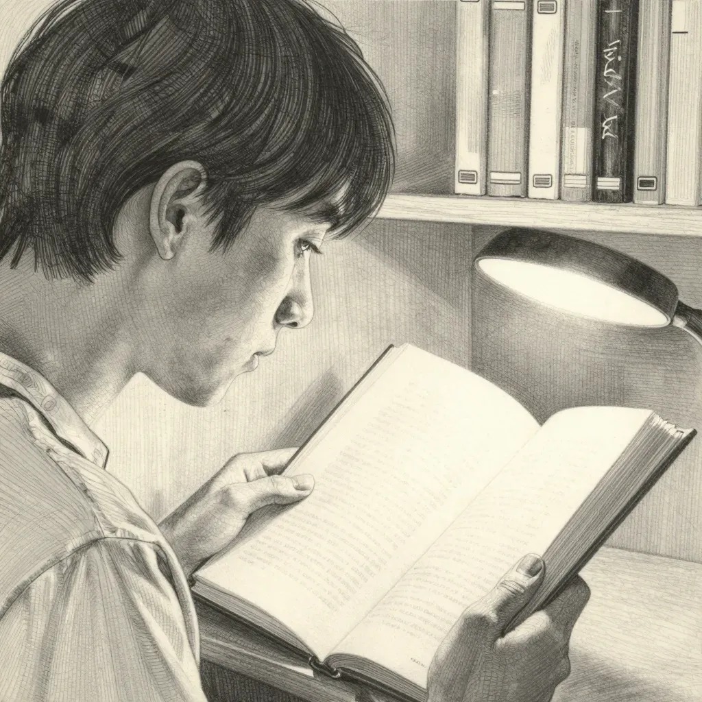 A young reader is deeply engrossed in a book, with fingers gently turning the crisp pages. The warm glow of the desk lamp highlights the texture of the book, casting soft shadows and creating a focused, intimate atmosphere.