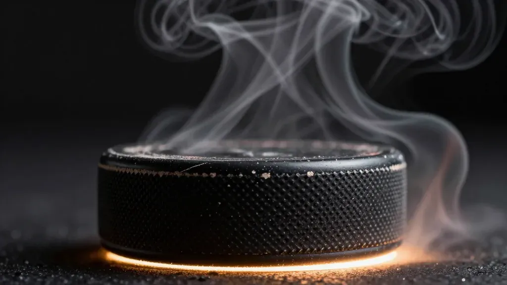 A dimpled hockey puck glows warmly from below, emitting wisps of smoke, creating a dramatic and ethereal effect. The shallow depth of field and dark background emphasize the puck as the focal point, making it ideal for high-contrast and atmospheric design elements.
