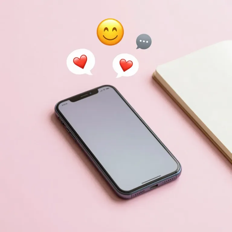 A smartphone and notebook rest on a pastel pink background, with floating emojis suggesting digital interaction. Soft, diffused lighting highlights the subjects, creating a clean and minimalist composition.