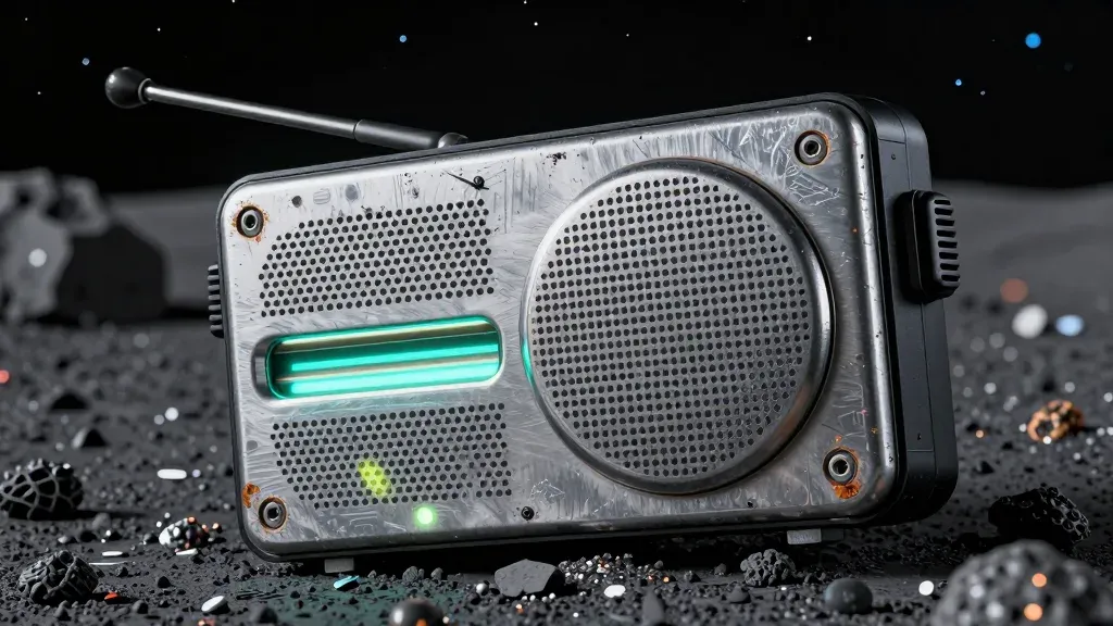 A cyber-radio transceiver with a rough, metallic texture and visible screws and vents, illuminated by soft, diffused light from a distant star, creating a glowing effect. The background, slightly blurred, features a lunar-like surface with scattered rocks and small, glowing orbs, emphasizing the device's futuristic and alien setting.