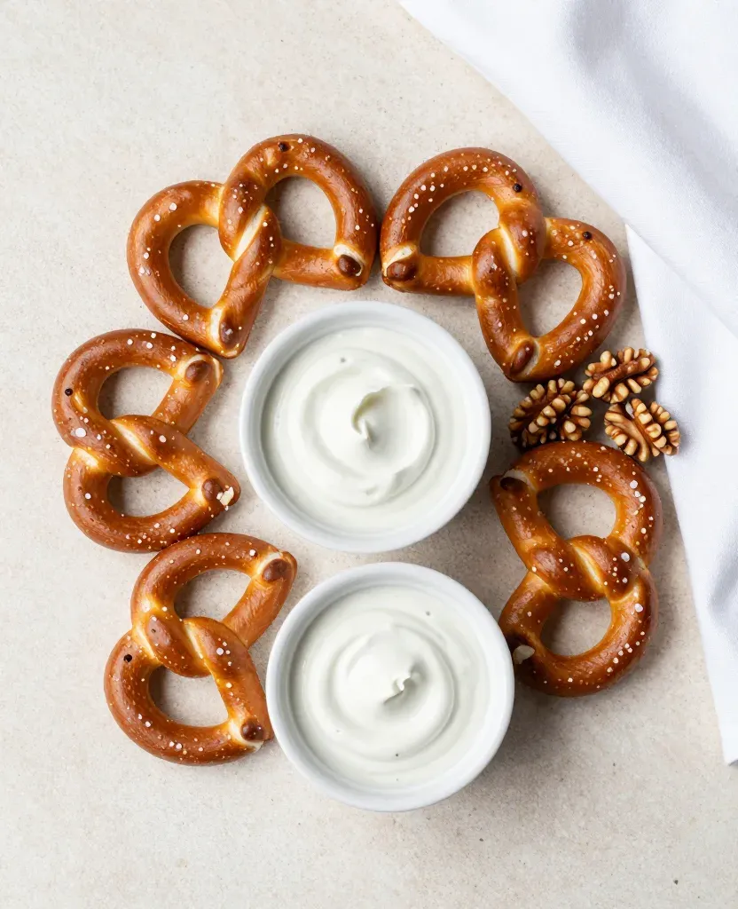 Golden brown pretzels arranged in a circular pattern around creamy white dip bowls, illuminated by soft, diffused light that creates gentle shadows and highlights, emphasizing the textures and colors of the food. The light beige background and slightly blurred edges enhance the focus on the subject, providing ample copy space for text or branding.
