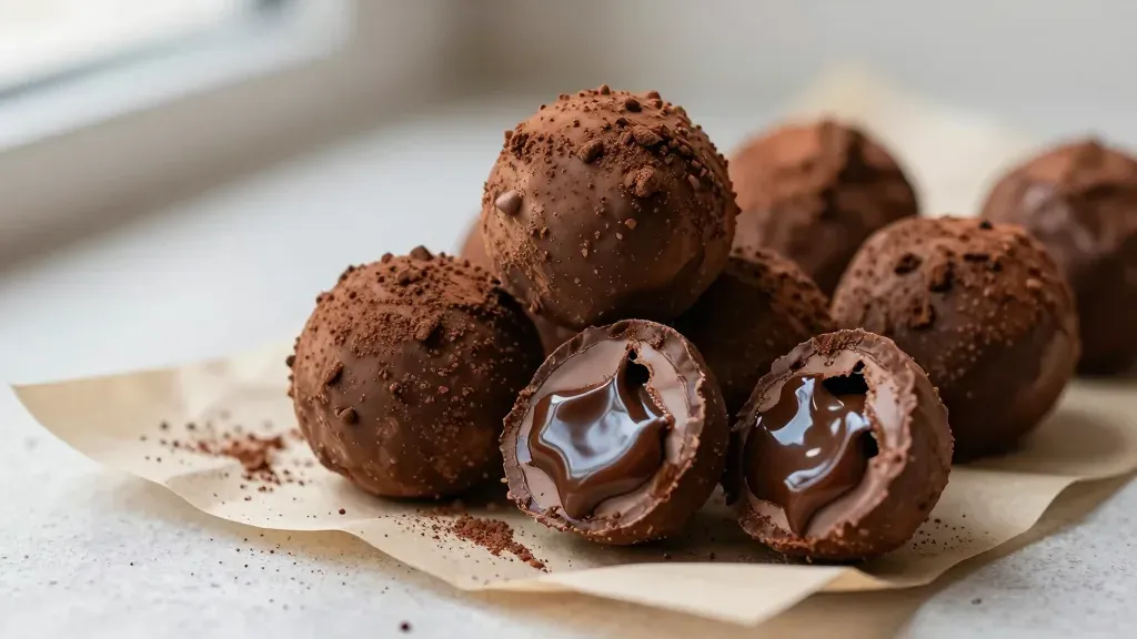Glossy chocolate truffles with a rough cocoa powder coating, revealing a creamy interior, softly lit from above to enhance texture and depth. The neutral, out-of-focus background ensures the truffles are the clear focal point, ideal for culinary or food advertising.
