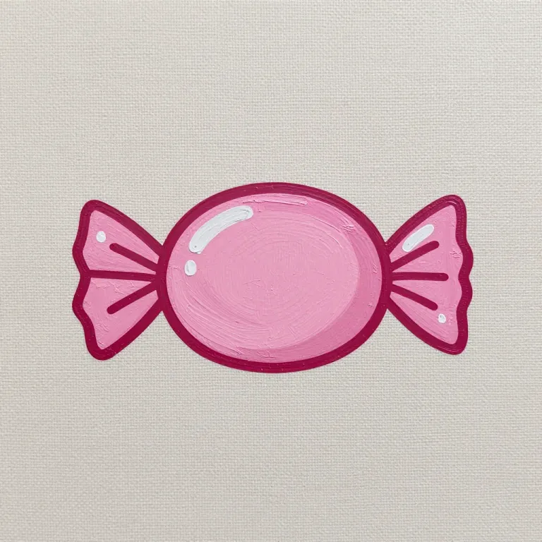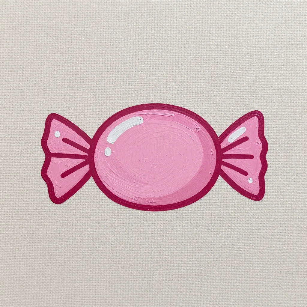 A glossy pink candy wrapper with smooth, slightly reflective texture, softly lit from the left, creating subtle highlights and shadows. The white textured canvas background is slightly out of focus, emphasizing the candy.