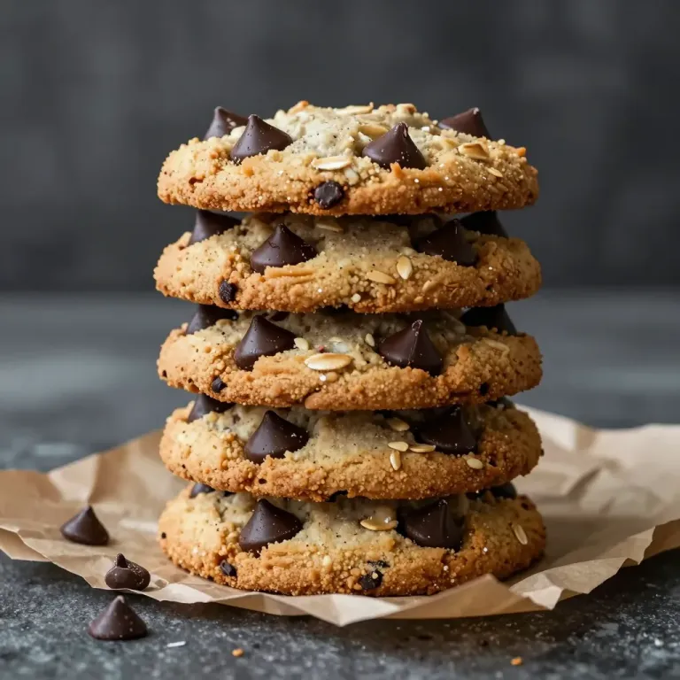 Golden-brown chocolate-chip cookies stacked in a pyramid, glossy chocolate chips and crunchy almonds, soft lighting highlights the texture, dark gray background blurs the focus on the cookies.
