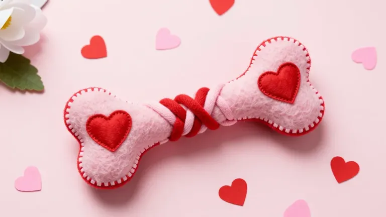 A soft pink felt bone-shaped craft features a central braid of red thread and red heart appliqués, with a fuzzy texture and defined stitching. The image uses soft overhead lighting with shallow depth of field, creating gentle shadows and highlighting the object against a matte pink surface with scattered paper hearts and a white flower in the corner.