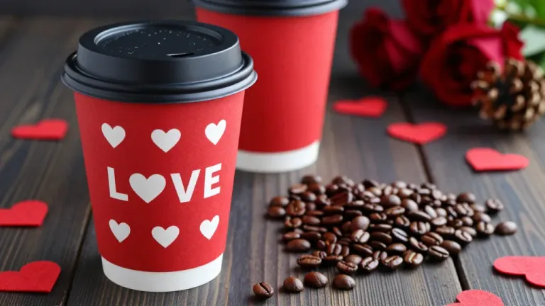 Two glossy red coffee cups with 'LOVE' and white hearts are placed on a wooden table, surrounded by scattered coffee beans under soft, diffused lighting. The shallow depth of field emphasizes the cups and beans in the foreground, creating a balanced and inviting composition.