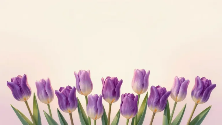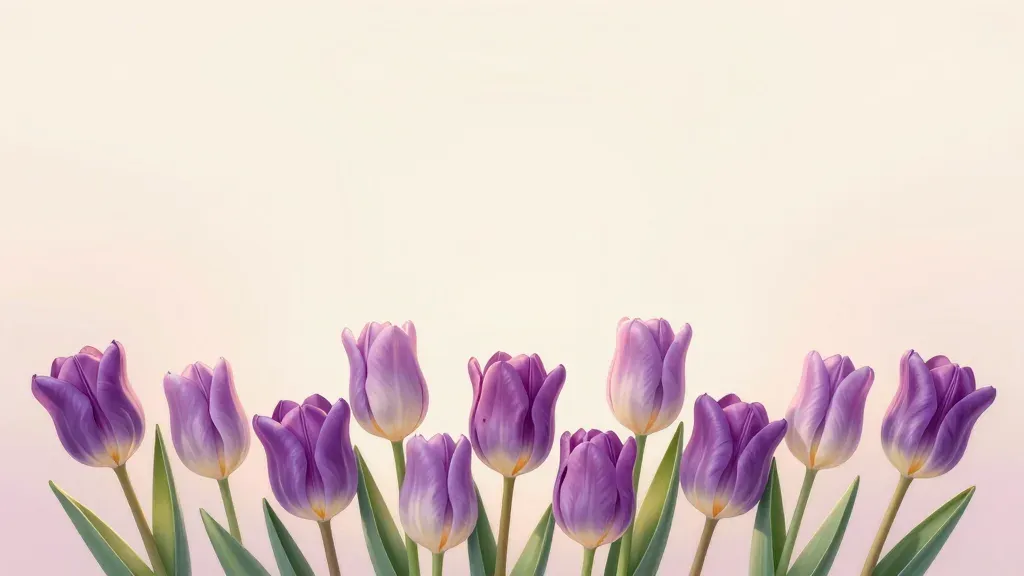 Elegant lavender tulips with slender green stems and glossy leaves softly lit by diffused, warm light, creating gentle highlights on petals and leaves. The neutral, light beige background slightly blurs the focus, emphasizing the tulips and providing ample copy space for text.
