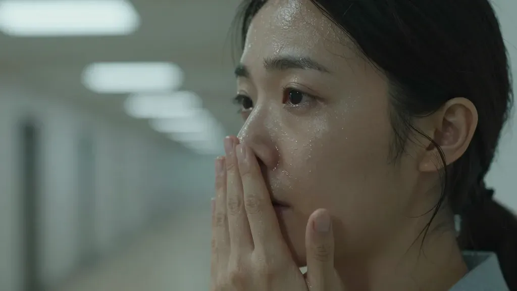 A woman's face, close-up, shows tension and sweat as she presses her fingers against her cheeks, illuminated by harsh fluorescent lights. The shallow depth of field blurs the hospital corridor background, emphasizing her emotional state.